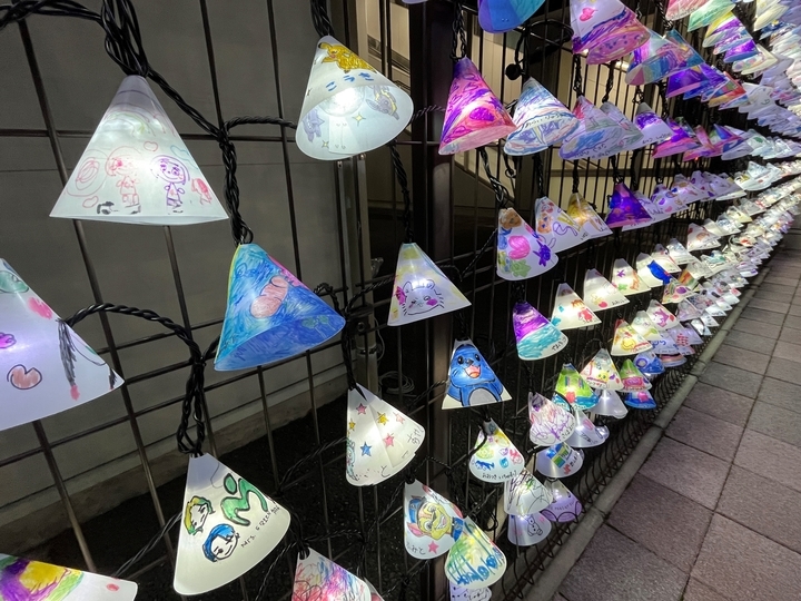 清掃後に点灯されたランプシェードには、FSGカレッジリーグ国際アート&デザイン大学校、WiZ国際情報工科自動車大学校、JT福島支社、芳賀公民館、NPO法人等のご協力のもと、地域の児童や中学生、専門学生一人ひとりが「楽しいとき」「嬉しいとき」をテーマに描いたイラストや文字が彩られています。