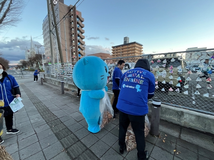 装飾に先立ち、同日、JT福島支社、ニラク、国際アート&デザイン大学校の学生ら約30人が、ニラクの公式マスコットキャラクター「ニラッコ」とともに郡山駅東口周辺で清掃活動を実施しました。訪れる方々に美しい環境でイルミネーションを楽しんでいただこうと、落ち葉やゴミ拾いを行いました。