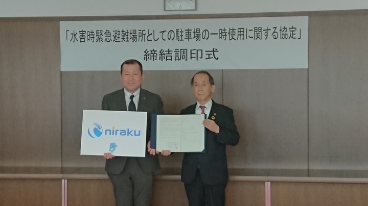 ■当社は、2022年2月22日(火)に、ニラク海老名本郷店と海老名市との間で「水害時緊急避難場所としての駐車場の一時使用に関する協定」を締結しました。
