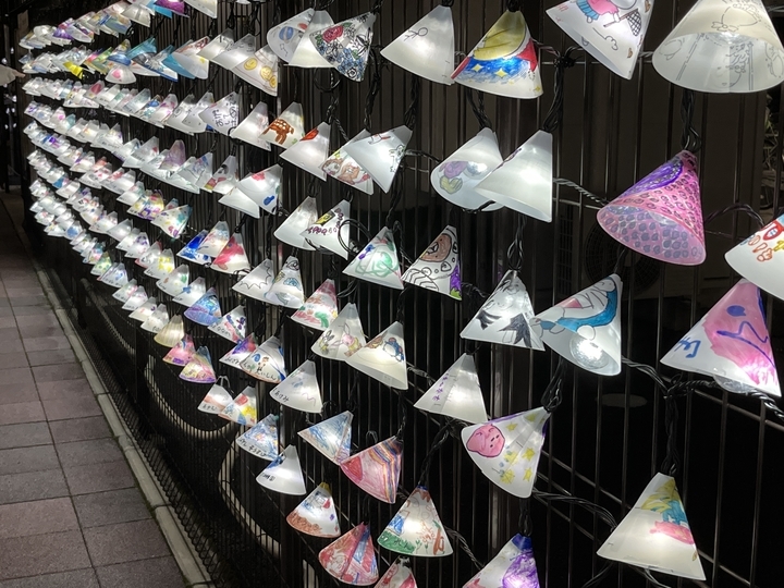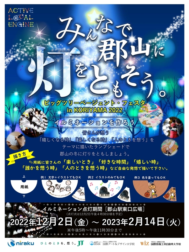 当社は、「第17回ビッグツリーページェント・フェスタin KORIYAMA」のイルミネーション点灯に合わせて、今年も郡山の冬を明るく楽しく面白くしようと、地域の子どもたち、小学生、高校生、専門学生などから集めた約600個のランプシェードを郡山駅東口に装飾しました。