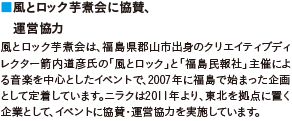 風とロックCARABAN福島に協賛|風とロックCARABANは、箭内道彦氏と開催地の代表者(首長、商工会・観光協会員)の方が地域のPRをしたり、現状と今後を語り合うトークショーやライブを行うなど、県内59市町村を巡り交流を図る地域に密着したイベントです。ニラクは2011年よりイベントの趣旨に賛同するとともに協賛しています。